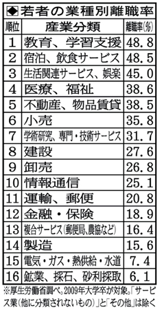 皆さん、左の表を見てください。これは、高校・大学を出て新卒で就職した若者のうち、3年以内に退職した者の業種別割合です。就職難の厳しい状況については、この間かなり詳細にお伝えしてきましたが、せっかく就職しても3年持たずに辞めてしまう若者が多いのです。今春の最新のデータ(つまり2009年就職組)では、高卒で36%、大卒で29%が3年以内に退職しています。3人に1人が辞めてしまっているという信じ難い現状ですが、さらに驚くのは、その中で、起業や転職等、次の仕事が見つかってから辞めている者は半分に満たないということです。新卒ですら就職が厳しいわけですから、既卒はさらに厳しい状況なわけで、その若者たちは、今何をやっているのでしょうか?