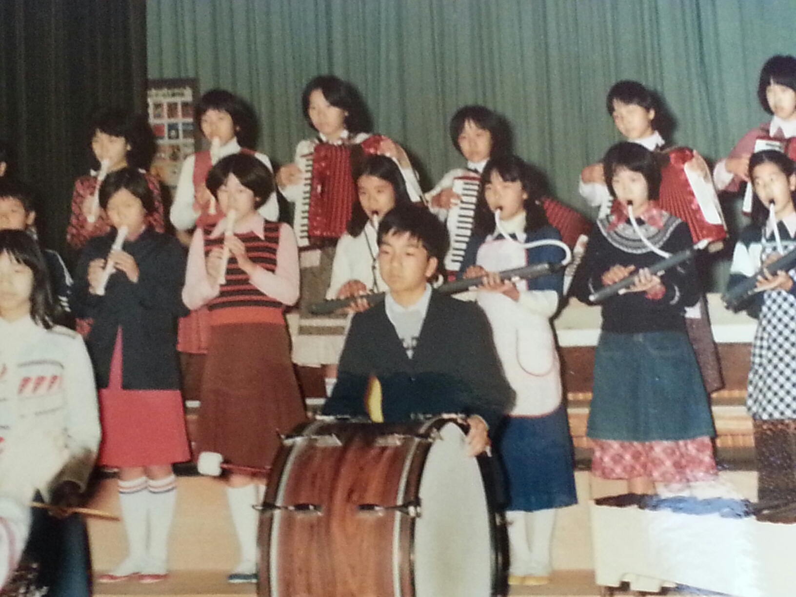 写真は、小6の秋の音楽祭での一コマです。吹奏楽部(音楽部と言ったかな?)の演奏の様子です。なぜか私がいます。見ても分かる通り、確か20数名の部員のうち男子は私1人だったと思います。(練習も苦痛だった記憶が…)