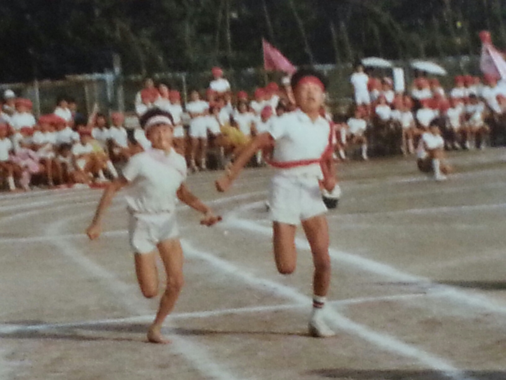 小学校ではなく、市の連合運動会の様子です。地域対抗リレーは、町ごとに小2~小6が1名ずつエントリーされて走りました。私は毎年ずっとこれに選ばれていました。(町ごとに予選会があったと思います。同学年の中でタイムが一番早かったということです)写真は私が小6の時のものです。