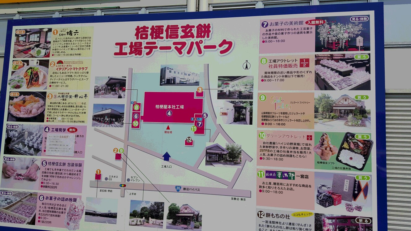 信玄餅を作っているのは「桔梗屋」さんと言う会社なのですが、本社・工場を一般に開放していて、製造過程が見学できるのです。もちろん、様々買い物もできるようになっています。お菓子のテーマパークと名付けているくらいですから… 袋の詰め放題が人気なのですが、私が行った時にはすでに終了してしまっていました。製造過程を見学して驚いたのは、人の手による職人の技がすごいということです。もちろんラインはオートメーションなのですが、そのところどころは人の技術によって成り立っています。例えば、あの1つ1つの信玄餅の包装は、裸の状態から1個数秒でパパッと縛ってしまうのです。とてもあんな風にはできないな…と思っていたら、工場見学を出たところで、包装の体験コーナー(有料)がありました。この商魂もすばらしいと感じました(笑)。お菓子で作った様々な展示物(樹木や動物等)も一見の価値があります。