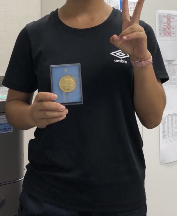 つい先日も、嬉しい報告がありました。陸上の個人種目で、東京都全体で1位を獲得して来た生徒がいるのです。金メダルを見せに来てくれたので、つい写真を撮ってしまいました。本人・保護者の方の許可をいただいたので、その写真を掲載しておきます。充実感溢れる表情をお見せできないのが残念ですが…