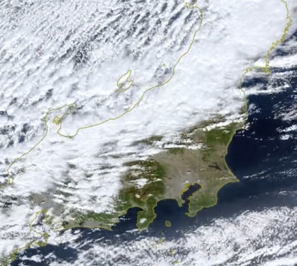 この2日間、特に朝と夜はとても寒いです。朝起きた時に、手元の温度計は氷点下を示していました。シベリアの方から、数年に1度という大寒波が襲来しています。東北・北海道の日本海側と北陸は、1日中氷点下が続いたり、雪が2日間で1mくらい積もったりして、結構大変な状況になっているようです。日本の背骨と呼ばれる三大アルプスや北関東の高い山々の威力は抜群で、風や雲が遮られるために、関東地方だけはまだ寒波が完全に入り込んでいないのだそうです。なので、昼間は気温が15℃くらいまで上がり、少しポカポカ陽気になっています。(ちょっと分かりにくいかもしれませんが、衛星写真を添付しておきます。こんなにのどかなのは、関東周辺だけなのです)