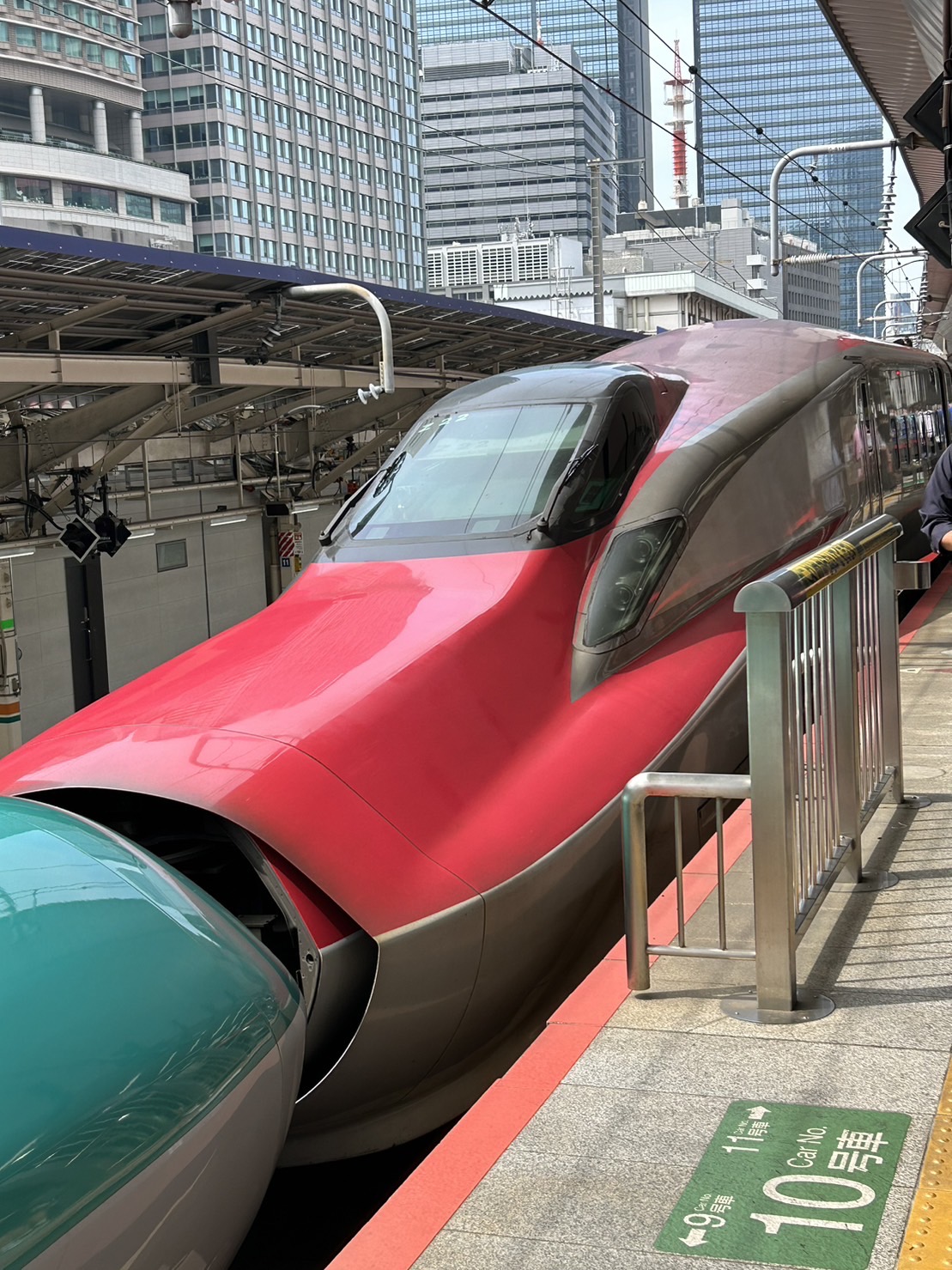 恐竜を見られなかった罪滅ぼしという訳ではありませんが、彼らが次に見たいのは新幹線だと言うので、東京駅に移動して、入場券を買って新幹線のホームに入り、間近でたくさんの新幹線を見ました。30分くらいはホームにいたでしょうか。3歳児が大好きな「はやぶさ」と「こまち」の連結部に大興奮して、「こまちに乗りたい~」と大泣きしていました。(さすがに秋田には行けないです…)