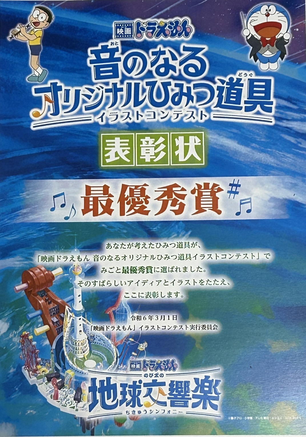 映画を観終わってから、(バンフレットに掲載されていた)息子の発明した「音がなるオリジナルひみつ道具」をまじまじと見て改めて感心しました。タイトルは「ハッピーすずおばけ」ですが、「この鈴を鳴らすと、町中の人が幸せになれる。みんなが仲良くなるともっと幸せになれる」というコンセプトが書いてあるのです。この映画を観る前から、映画のコンセプトを分かって書いたかのようですよね。イラスト(特にすずおばけの表情)もうまいのですが、そりゃ入選するだろう…と感じました。(親バカすみません…)