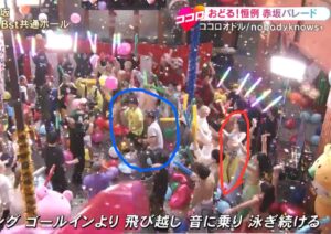 生憎私は仕事中で、授業・面談もあり、リアルタイムでは観られませんでした。娘がテレビをスマホで撮った動画を送ってくれましたが、バタバタしていたので、帰宅してから「TVer」でじっくり観ました。うちのテレビは録画機能がないのですが、TVerは本当に便利ですよね。CMはかなり多いですが、無料です。私は、妻がどんな衣装を着てどの辺にいるかをだいたい分かった状態で観ているので見つけられましたが、知らない方がサラッと観たらなかなか気付かないかもしれません。メインのアーチストのすぐ後ろで踊っていたのですが、スタジオには他のアーチストたちもたくさんいて、どうしてもその影に隠れる形になってしまうため、正面から撮っているカメラにはチラッとしか映っていませんでした。上からのアングルのカメラだとよく分かるのですが、今度は小さくなってしまうので、顔までは判別できない感じでした。下の写真だと立ち位置がよく分かると思います。青丸がnobodyknows+の(うちの)お2人、赤丸が妻です。結構近い立ち位置だったんですよね…