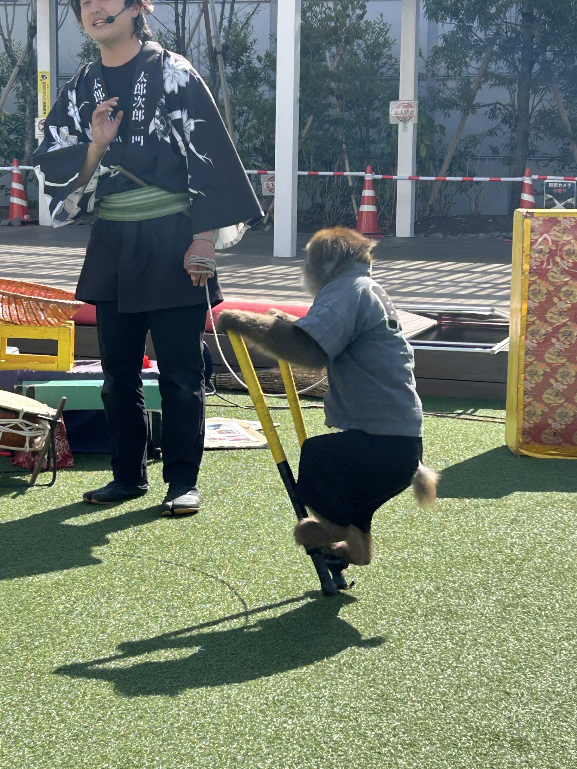 〇八王子テラスで「日光猿軍団」のショー→お客さんはほとんどおらず、最前列の真ん中至近距離で観られる。