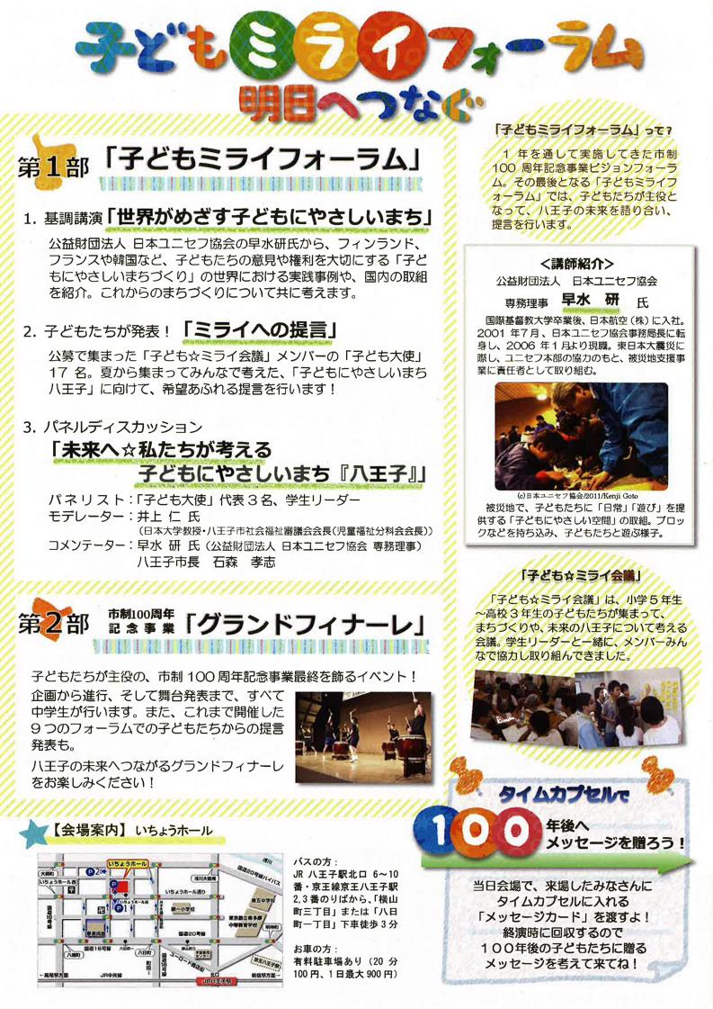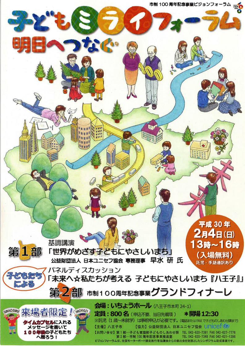 今度の日曜日2月4日に、いよいよ八王子市の「子どもミライフォーラム」が開催されます。市制100周年の記念行事の一環なのですが、そのグランドフィナーレとして、「いちょうホール」で大々的なイベントが開催されます。