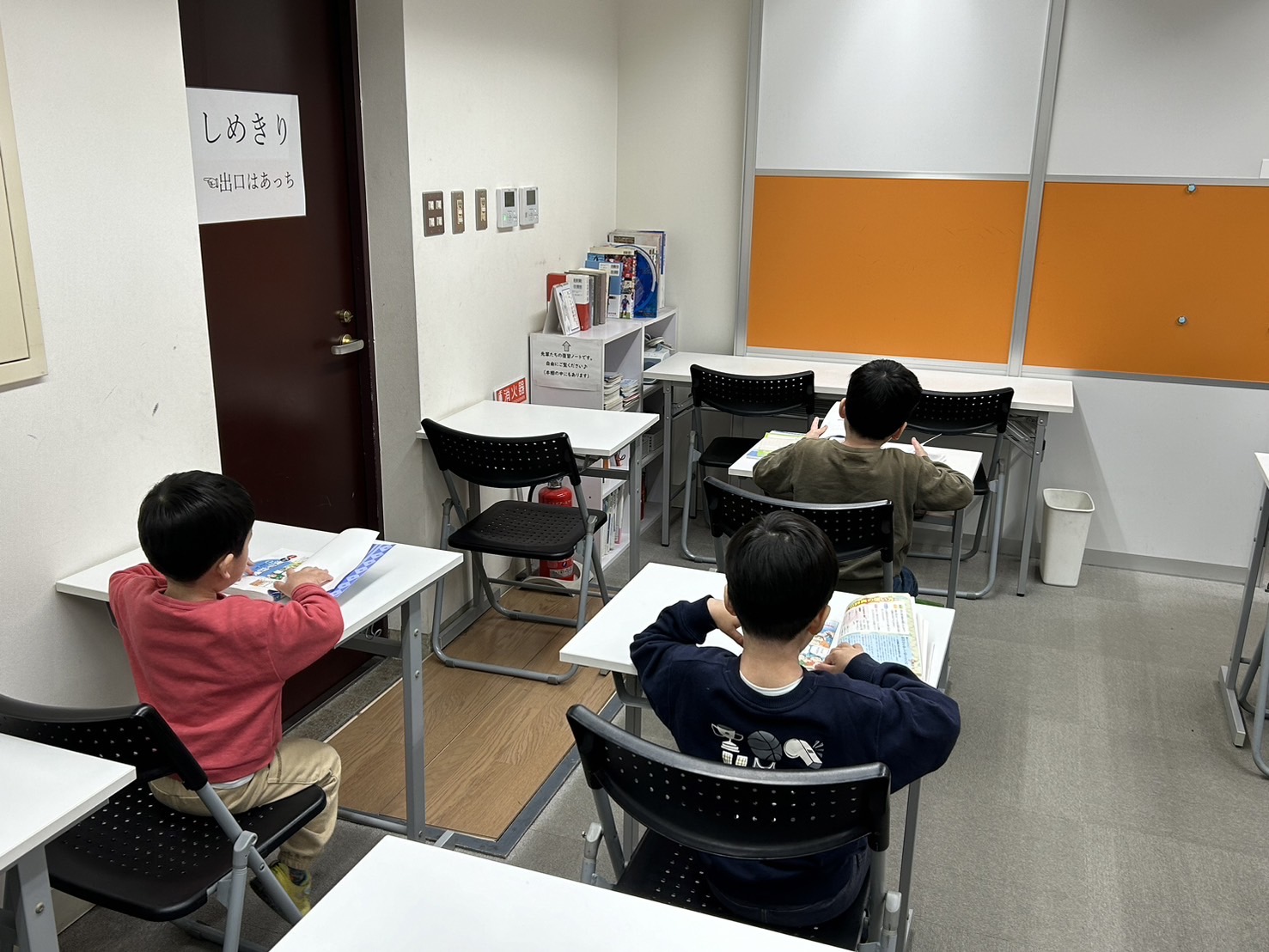 となると、GSに全員連れて行かざるを得ません。長女は英語の授業、長男は自分の宿題に取り組んでいましたが、下の2人も自習室で本を読んだりお絵描きをしたりして過ごしていました。
