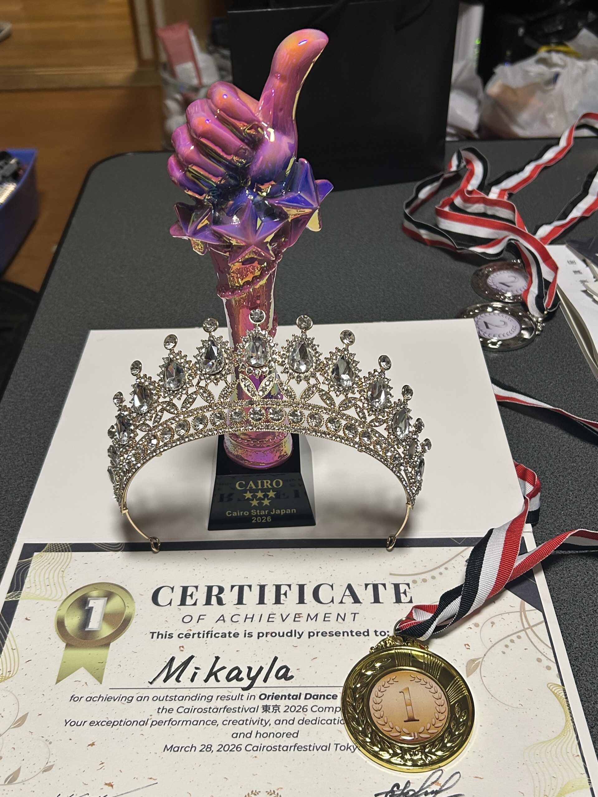 そんな青春時代を送っていたので、運動・スポーツはからっきしだったようです。内申はいつも体育だけ4だったと言っていました。(それでも4はもらえるのか… 他全部5というのは凄い。私とは大違いだ笑) そんな妻が、結婚して妊活対策のためにダンスを習い始めました。それまでダンスはやったことはなく、まったくの素人からの出発でした。タヒチアン・フラから始まって、行き着いたのがベリーダンスでした。あれから10年くらい経ちますが、練習に取り組むストイックさは、私から見ても常軌を逸しています。家の1室をダンス部屋に改造して(鏡張り!)、暇さえあれば踊っていたり、振り付けの研究に没頭しています。週に3日、NASというジムでダンスのインストラクターをしていますが、それ以外の日もほぼ毎日、スタジオ(エスフォルタをはじめ、近くに4つくらい拠点があります)を借りて踊り込んでいます。月に何度かはレストランでのランチショーやディナーショー(GSの保護者の方にも多数お越しいただいています)、数ヵ月に1度は大きなコンペ、年に何度かは海外でのショーやコンテストに出かけています。